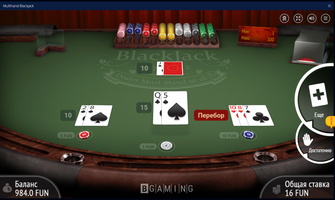 Когда клиент «блэкджека онлайн» принимает решение, что для выигрыша ему нужно добрать еще очки, тогда он может заказать еще одну дополнительную карту, воспользовавшись кнопкой «раздать». Участник виртуального казино имеет право повторять данную функцию до тех пор, пока имеет на играющем боксе меньше двадцати одного очка. Не стоит забывать о таком понятии, как «перебор».