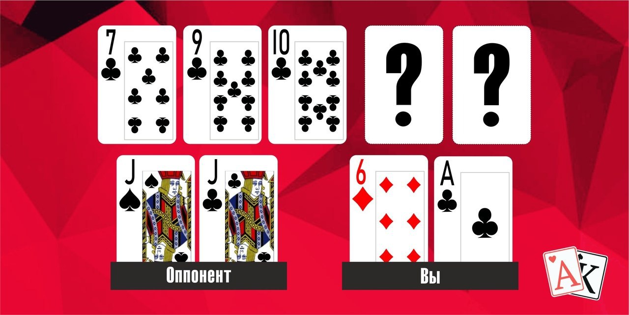 Постараемся дать оценку возможностям. Вы имеете пару оверкарт, следовательно, имеете шесть аутов. Рассчитанные пот-оддсы говорят о том, что Вы не найдете необходимого туза или короля (их значение равняется 6,83 к 1), а пот-оддсы, рассчитанные для колла, равняются 7,5 к 1. Не нужно полагать, что подобный колл дастся Вам легко, так как нужно еще принять к сведению возможность прихода туза на терне, который не принесет Вам необходимого усиления, а позволит противнику сложить более мощную комбинацию.