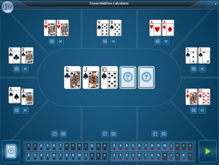 В нашем примере на борде появились следующие карты: 5h,6h,Jd,8c. У Вас на руках Ah и 3h, Вы имеете оверкарту или флеш дро. Исключим возможность наличия пары тузов, которых было бы достаточно для победы. Учтем только вероятность сбора флеша.