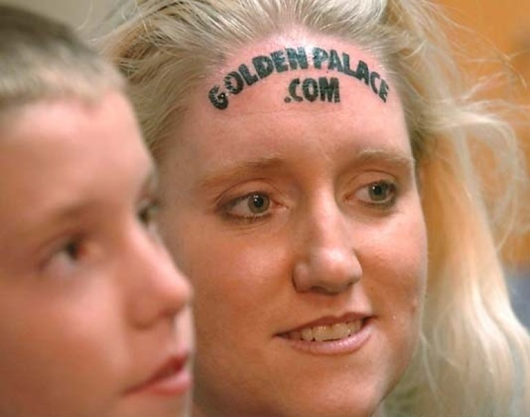 Отметим, что впервые к рекламе в виде татуировки на лице обратились владельцы интернет казино Golden Palace. Руководство этого виртуального заведения в 2005 году выкупило на аукционе Ebay за десять тысяч долларов рекламное место на лице американки Керол Смит, а конкретнее на лбу.