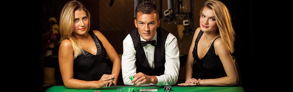 Парень-крупье и двое блондинок-крупье за игровым столом