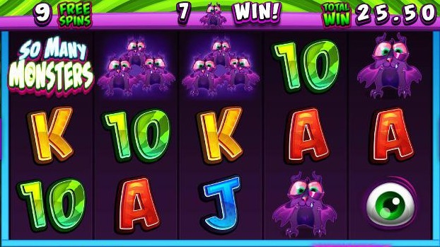 So many monsters – пятибарабанный игровой слот с 25 линиями выплат. На спин можно поставить от 25 центов. Максимальная ставка составляет 100 долларов. Один из монстров – это просто глаз (Eyez). Есть и монстр в виде лягушки (Frogmosher), монстр с кучей глаз и так далее.