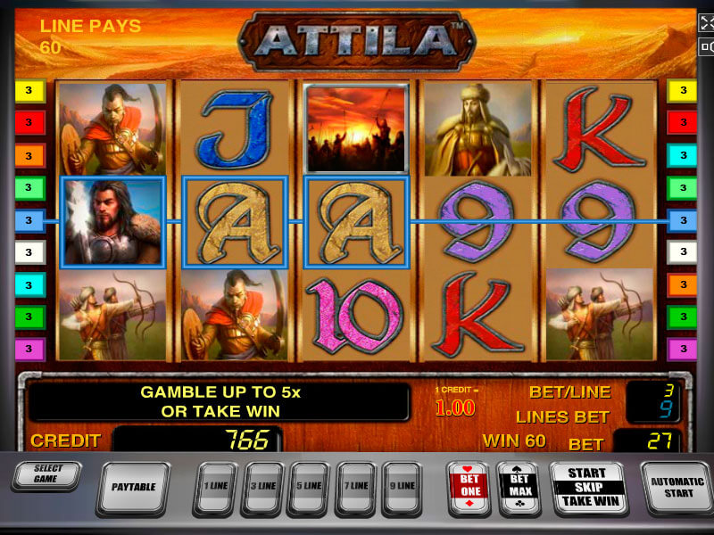 Игровой автомат «Attila» выполнен в военном стиле начала нашей эры.
