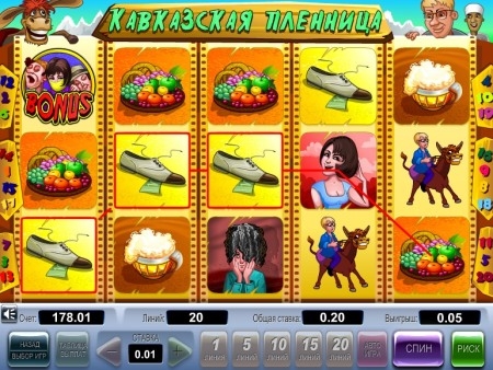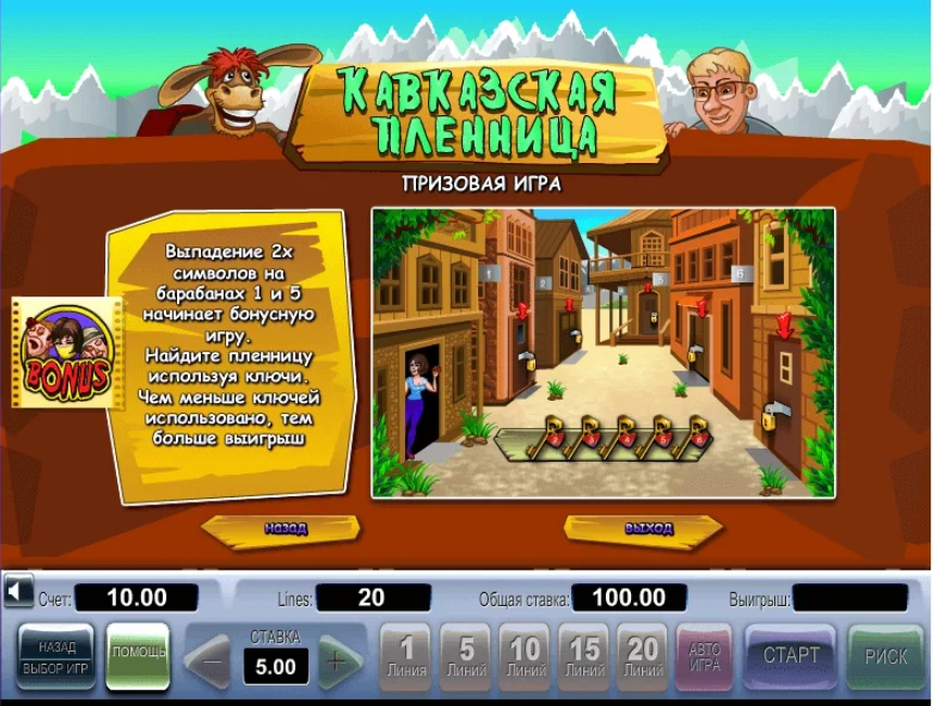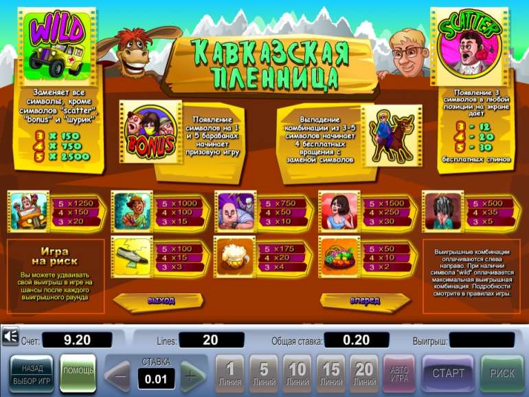 Игровой автомат Кавказская пленница представляет собой игровое поле с пятью барабанами и двадцатью активными линиями. Игра оснащена различными бонусами, специальными символами и риск-игрой.