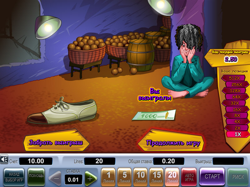 Чтобы активировать игру достаточно выбрать опцию «Риск». Перед вами появится один из героев «Кавказской пленницы», который предложит выбрать ботинок, под которым лежат деньги.