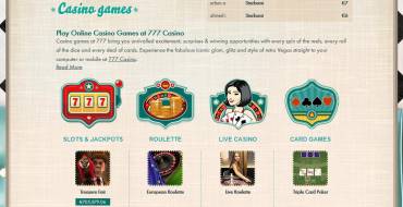 Игорные порталы с нестандартным дизайном всегда привлекают внимание пользователей, так что операторы, которые не боятся отойти от классических канонов в этом вопросе, поступают правильно. 777 casino, обладая отнюдь не оригинальным названием, в плане дизайна как раз приятно удивляет. Необычная структура, приятный ретро-стиль, интересный подход к организации разделов меню – все это производит отличное впечатление.