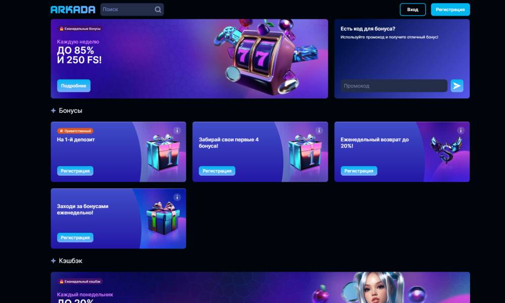 Каждую неделю Arkada Casino предлагает игрокам бонусы на депозиты: