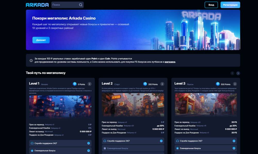 Статус в Arkada Casino зависит от активности игрока на платформе, количества сделанных депозитов и суммы ставок. Повышение статуса открывает дополнительные привилегии, включая большие лимиты на вывод средств и дополнительные бонусы.