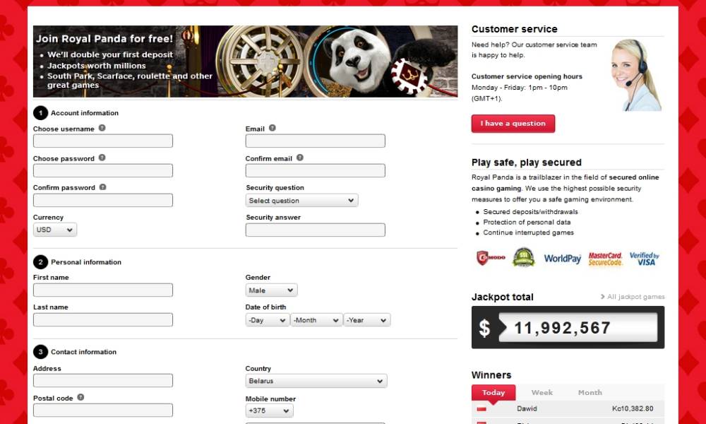 Чтобы получить возможность играть на деньги в Royal Panda casino, получать бонусы и участвовать в различных акциях, нужно зарегистрироваться. Анкета состоит из традиционных пунктов. Их нужно заполнить достоверной информацией. Открывать несколько счетов запрещено.