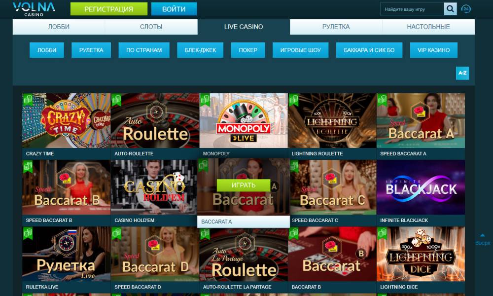 Игры с настоящими дилерами также представлены в онлайн-казино Волна. Их действительно много, и все они качественные.
