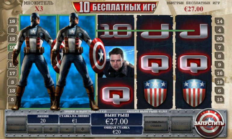 - В качестве примера можно привести модель Captain America – The First Avenger («Капитан Америка – Первый мститель»), который недавно выпустила компания Playtech. Он интересен тем, что в нем действует два «диких» символа. Капитан Америка удваивает выплаты по комбинациям, которые состоят из символов, имеющих отношение к данному персонажу, а Красный Череп, соответственно, увеличивает коэффициенты лишь по «своим» картинкам.