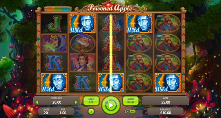 - Poisoned Apple - Игровой автомат «Отравленное яблоко» компания Booongo посвятила сказке братьев Гримм о Белоснежке и гномах. Джокеры в слоте заменяют другие картинки и задействуют функцию Mirror Wild. Если этот символ выпадает в средней колонке, все другие джокеры зеркально отображаются по горизонтали. В бесплатных вращениях они также могут расширяться, добавляться в случайно выбранные ячейки и задействовать другие призы.
