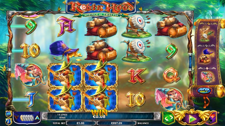 - Robin Hood: Prince of Tweets – В этом игровом автомате о Робине Гуде есть интересная функция под названием Robin Hood’s Arrow. Символом Wild является изображения главного героя, представленного в образе птички. Изначально он выпадает лишь на третьем барабане. Если активируется данная опция, Робин выпускает стрелы во все картинки, которые его касаются, превращая их в дополнительные Wild. При этом в автомате есть два вида бонусных ставок. Если они активны, расширяется количество символов, которые могут подвергаться этой трансформации. Детали в обзоре слота.