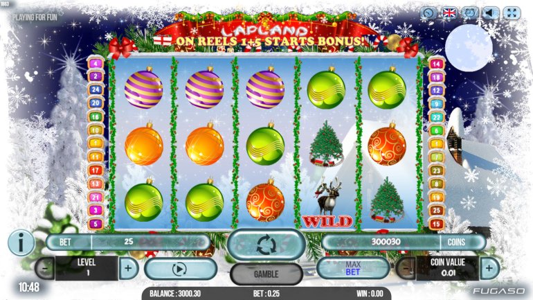 Видеослот Lapland компании Fugaso посвящен родине Санта-Клауса. В Лапландии вас ждут многочисленные выплаты по комбинациям, образующимся на двадцати фиксированных полосах. Кроме базовых картинок, доступны джокеры, скаттеры и бонусные символы. Также реализована риск-игра в стиле сравнения карт.