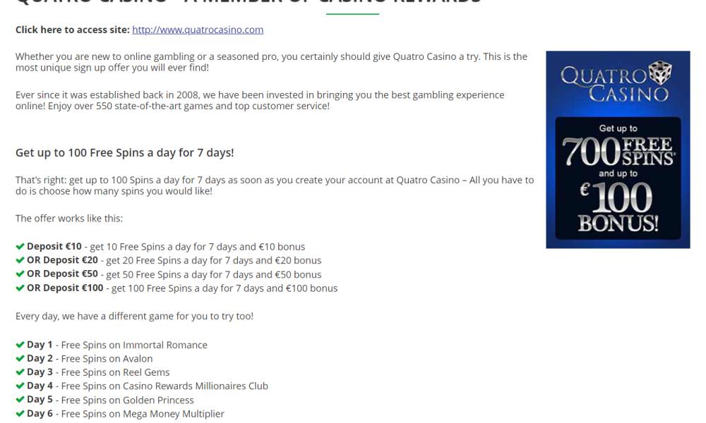 В рамках приветственного предложения Quatro Casino предоставляет 100% бонус и до 700 фриспинов на первый депозит на сумму от от €10 до €100 и более.