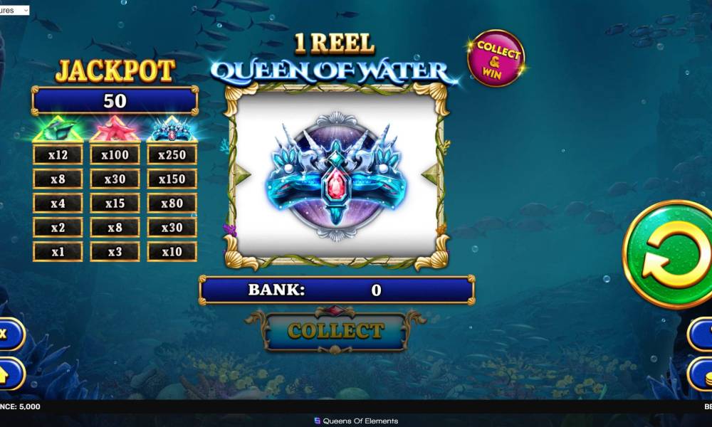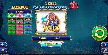 Интерфейс слота 1 Reel Queen Of Water не слишком понятен начинающему игроку, никогда ранее не имевшему дела с подобными автоматами. В центре экрана находится барабан с единственной ячейкой для символов. Слева от него можно увидеть счетчики знаков, а над ними расположилось значение джекпота. Под игровым полем размещается кнопка сбора выигрыша.