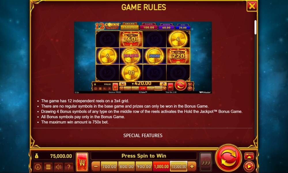 Виду стандартам онлайн слота и его простоте были прописаны правила игрового процесса в слот 12 Coins, предлагаю ознакомиться. В игре отсутствуют классические линии выплат, так как основное внимание сосредоточено на бонусных символах и активации бонусной игры. Игровое поле имеет сетку 4x3, а размер ставки варьируется от 0.2 монеты до 10000 монет за один оборот барабанов.