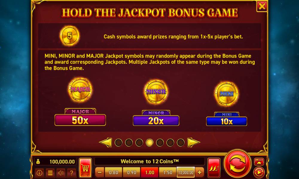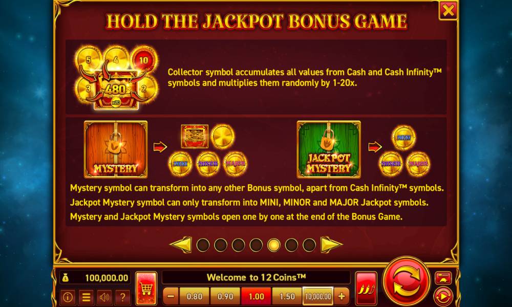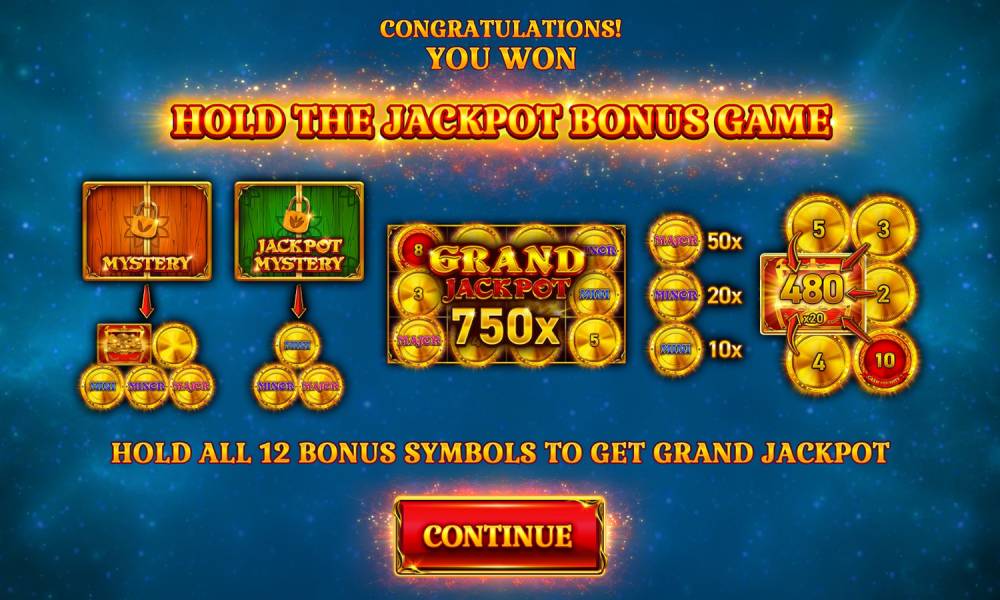Grand Jackpot выплачивается при заполнении всех 12 позиций бонусными символами в раунде Hold The Jackpot и составляет 750x от ставки.