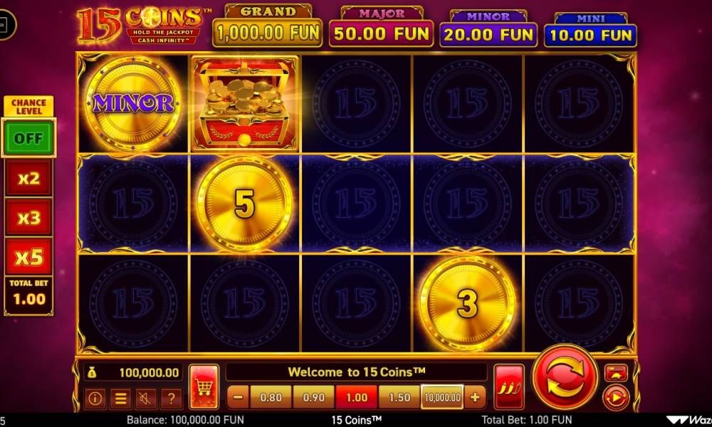 Британский провайдер Wazdan в 2022 году создал линейку Coins. Сейчас в ней уже больше десятка слотов. В июле 2023 года она очередной раз пополнилась новинкой под названием 15 Coins. В ней игрок может сорвать 4 джекпота, собирая золотые монеты на поле размером 5х3.