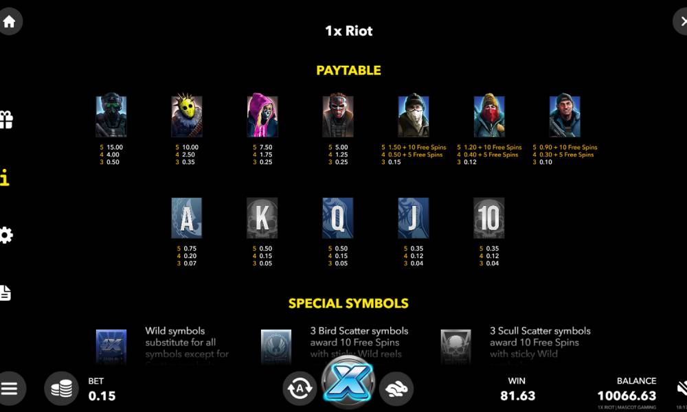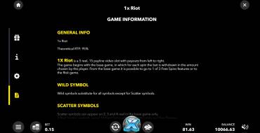 1X Riot выпущен в середине осени 2024 студией Mascot Gaming. Входит в серию из нескольких слотов Riot, посвященных постапокалиптической тематике. Имеет небольшое поле, несколько видов фриспинов с разными бонусными функциями, и классическую механику выплат по линиям. Есть риск-раунд. Лимит по выигрышу сравнительно небольшой и составляет х1500.