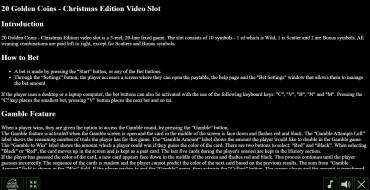 В онлайн-слоте 20 Golden Coins — Christmas Edition пять барабанов располагаются на фоне сказочного елового леса. В игре принимают участие 3 старших и 3 младших символа, которые составляют призовые комбинации из 3-5 штук. Выигрышные знаки должны располагаться с первого барабана подряд на линиях для выплат, которых предусмотрено фиксировано 20. Также есть три специальных символа, которые связаны с денежными вознаграждениями и бонусными возможностями аппарата. Провайдер добавил дополнительно раунды Jackpot Cards и Gamble. Диапазон ставок в слоте 0.2-40 евро. Хоть он и не большой, зато выигрыши аппарат способен давать крупные. Максимальная награда составляет х10000 от ставки.