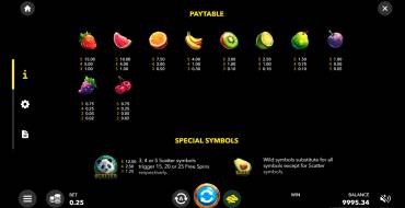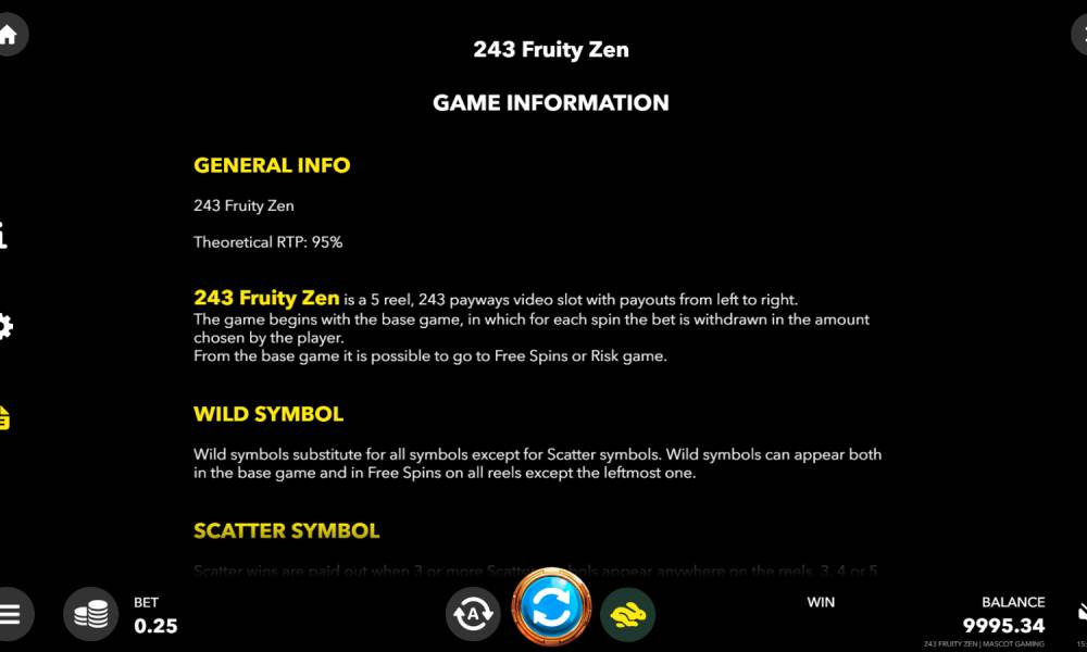У 243 Fruity Zen яркий интерфейс, но расцветка не мешает играть. Слева от поля находится кнопка Buy Feature. Все остальные кнопки расположены внизу. В левом углу разместились меню и выбор ставки. В меню гемблер найдет таблицу выплат, раздел с общей информацией и настройки. В настройках можно отключить звуки барабанов и музыку, запретить риск-раунд и развернуть игру на полный экран. По центру под полем находятся кнопка ручного запуска, ускорение или замедление барабанов и настройки автоматических вращений. В правом нижнем углу отображается баланс, а рядом с ним появляется только что выигранная сумма. Я провел пробную сессию и советую гемблерам следующее: