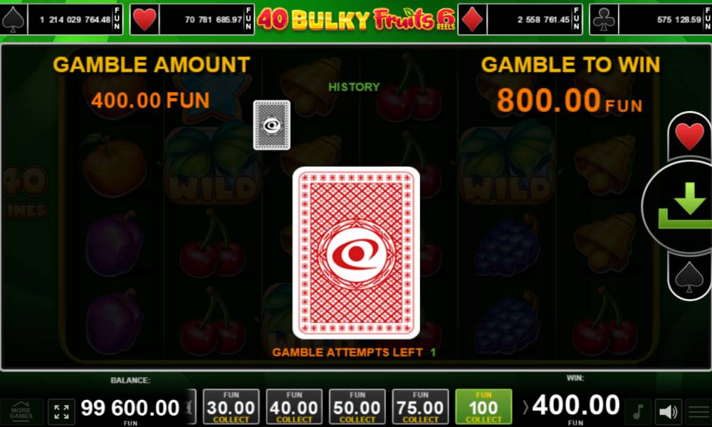 Максимальный адреналин игроки испытывают в погоне за крупным призом. В онлайн-слоте 40 Bulky Fruits 6 Reels тоже есть за что побороться. Ведь здесь присутствуют четыре прогрессивных джекпота. Они соответствуют карточным мастям. Как выиграть джекпот? Переворачивать карты по одной до тех пор, пока не будут найдены три одинаковых. Масть и будет обозначать приз. Его размер отображается над барабанами. Хорошо то, что он все время растет, а останавливается и сбрасывается лишь в момент выигрыша. Это позволяет получать крупные джекпоты.