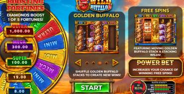В 5 Wild Buffalo 2 используется популярное игровое поле размерами 5х4. Для образования выигрышной комбинации символы должны располагаться на соседних барабанах. Абсолютно любой знак может принести алмазы Boosting Fortunes, увеличивающие шансы выпадения джекпотов. Учет выигрышных сочетаний символов проводится слева направо, от 3-х одинаковых подряд (для стеков Buffalo требуется всего 2). Ставку игрок может назначать из диапазона от 0.2 до 80 евро. Максимальный выигрыш может достигать х7500 за раунд. Бонусы представлены в виде фриспинов, сопровождаемых золотым шагающим символом Buffalo с множителем. Обычные джокеры также способны растягиваться и приносить Multiplier.