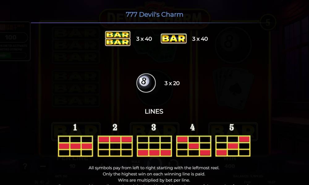 Игровое поле слота 777 – Devil’s Charm включает три барабана, каждый из которых имеет в высоту по три ячейки. В процессе игры задействовано семь обычных символов и один с особыми возможностями. Размер ставки можно устанавливать до 50 евро, но активация Retro Bet удваивает ее. Примечательно, что дополнительный коэффициент выигрыша получает лишь один символ, 777. Простые и понятные правила в сумме со средней волатильностью — идеально дополняют ретро-стиль игры, делая ее доступной даже для новичков в азартных развлечениях. Фриспины и прочие бонусы отсутствуют.