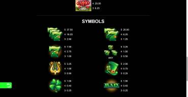 На барабанах изображены одинарная, двойная и тройная семёрки, музыкальный инструмент лира, цилиндр лепрекона, четырёхлистный клевер и BAR. Одинаковые иконки могут появляться в колонках вертикальными стеками. Разные семёрки могут формировать смешанные комбинации.