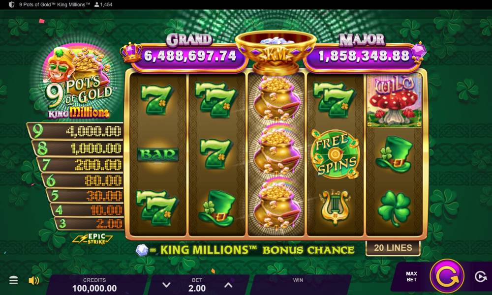 В 9 Pots of Gold: King Millions провайдер добавил 2 прогрессивных джекпота: Major (меньший) и Grand (больший). На них не распространяется ограничение по выигрышу в х2000 от ставки. Джекпот можно урвать в King Millions Bonus Wheel.