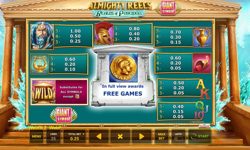 В игровом автомате Almighty Reels: Realm of Poseidon пять барабанов и двадцать пять постоянно активных полос. Иконки располагаются в три ряда. Ставку на линию уточняйте в онлайн-казино, так как операторы могут определять разные лимиты.