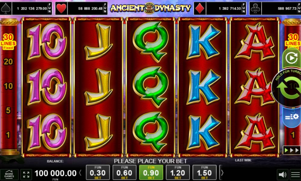 Игровая сетка аппарата Ancient Dynasty имеет формат 5х3. В слоте есть 2 высоко-, 3 средне- и 5 низкооплачиваемых символа. Все они дают награду за 3-5 штук на линии. Собираются комбинации строго слева направо с первого барабана подряд. Линий для выплат фиксированное количество — 30. Провайдер добавил три дополнительных раунда — Free Spins, Gamble, Jackpot Cards. Диапазон ставок в автомате широкий — 0.01-1000 евро, так что можно играть с удобными для себя суммами. Пользователи могут рассчитывать на максимальный выигрыш х10000.