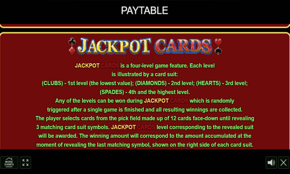Четыре уровня джекпотов есть в автомате Ancient Dynasty. Они соответствуют по виду карточным мастям, ведь, чтобы сорвать крупный куш, игрок должен собрать три пики, черви, бубны или трефы. Все джекпоты не фиксированные, они прогрессивные. Это означает, что у них есть минимальные и максимальные значения. После выигрыша приз всегда сбрасывается, а потом снова растет. Узнать текущий размер джекпота можно вверху экрана. Раунд Jackpot Cards запускается случайно, когда на поле появляются 12 карт. Игрок должен их переворачивать, пока не найдет три одинаковых. На этом игра закончится и приз сразу будет выплачен.