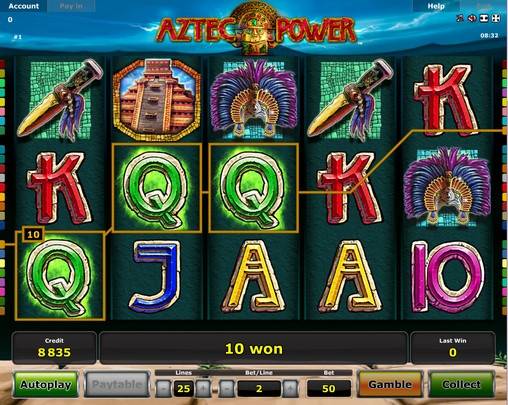 Aztec Power обычный игровой автомат с простыми правилами,как говорится на любителя!Без всяких бонусов!Удобный и понятный интерфейс!Игру усвоит даже новичок!Для разнообразия можно парочку раз сыграть!