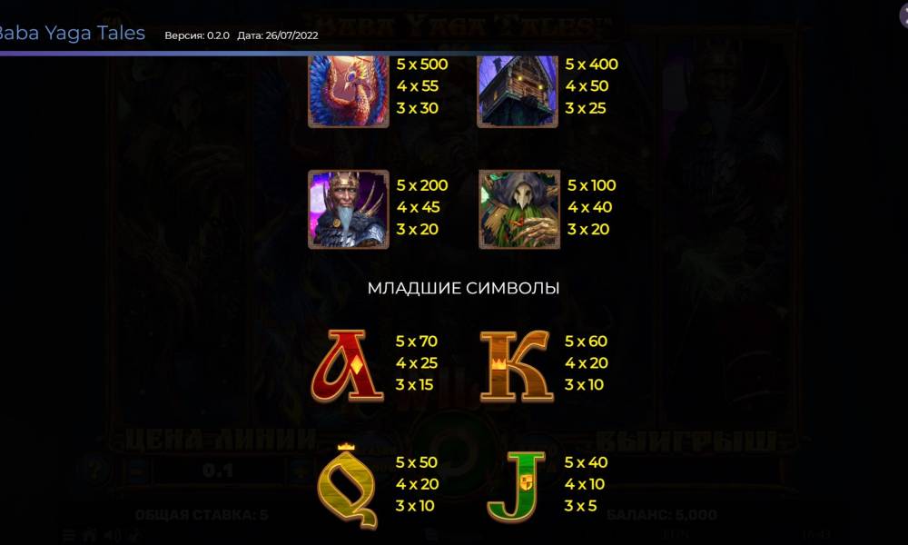 Интерфейс в слоте Baba Yaga Tales привычный для поклонников игр от Spinomenal. Под верхним логотипом игры расположено поле с барабанами. Снизу находится панель управления, где происходит запуск барабанов, выбирается ставка и можно узнать размер выигрыша. Таблица выплат и справочная информация спрятаны под кнопкой с тремя горизонтальными полосками.