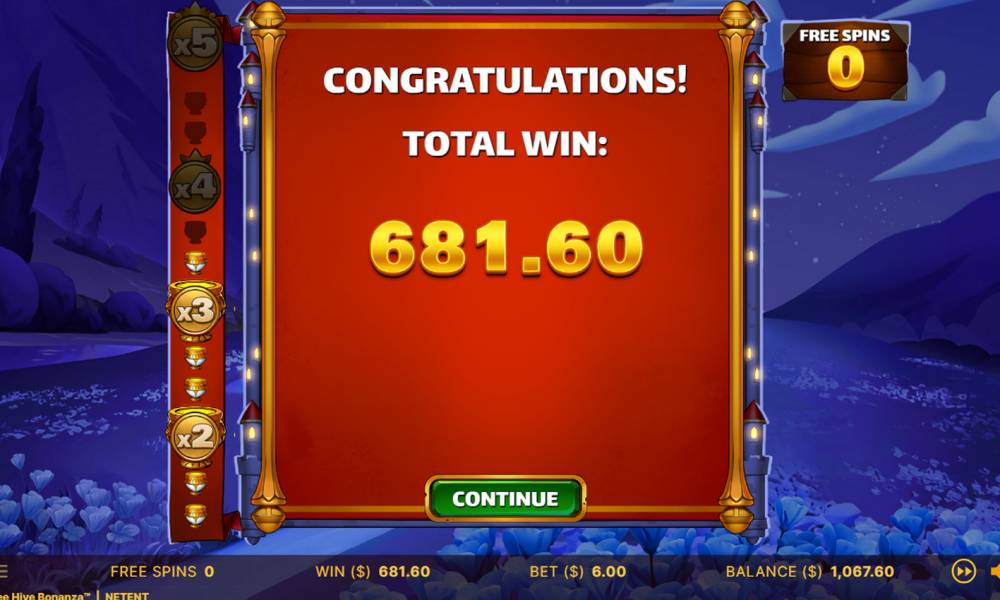 Если на барабанах выпадет 3, 4 или 5 Honey Pots, гемблера вознаградят 10, 15 и 20 бесплатными вращениями соответственно. Если ждать не хочется, можно заплатить х100 от ставки, и купить гарантированное появление 3+ таких знаков в следующем спине через функцию Buy Feature. Во время бесплатных вращений на барабанах могут выпасть дополнительные Honey Pots. Они будут заполнять лестницу множителей слева. За каждые 3 таких знака будет расти дополнительный множитель: до х2, х3, х4 и х5 (максимальное значение).