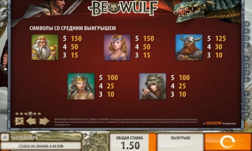 Если вы знакомы с продукцией компании Quickspin и уже успели полюбить их великолепные видео-слоты, вам точно понравится онлайн игровой автомат Beowulf. Если же вы никогда не играли на моделях этого производителя, начните знакомство с ними, запустив Beowulf. Мы обещаем, что вам придутся по душе его оригинальные функции, отменная графика, комфортный русскоязычный интерфейс и другие особенности.