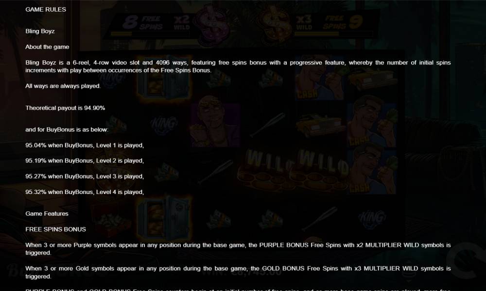 В слоте Bling Boyz 6 барабанов по 4 ряда символов. Есть младшие и старшие знаки (по 6 и 5 видов соответственно), которые составляют комбинации на соседних катушках, начиная с первой. Для выплаты необходимо от 2 для дорогих и от 3 для дешевых до 6 одинаковых символов. Это дает 4096 способов получения наград и больше шансов на приз. Диапазон ставок 0.6-90 евро с большим выбором. Пользователи могут рассчитывать на максимальный приз х6480 от поставленной суммы, а также на множители и бонусные раунды. Для нетерпеливых и любящих экстрим игроков провайдер сделал возможность покупать фриспины.