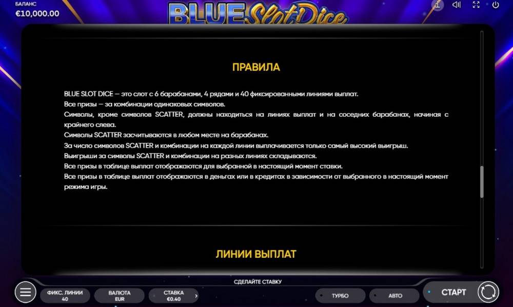 Blue Slot Dice – слот с 6 барабанами в 4 ряда и 40 фиксированными линиями выплат. Варианты размеров ставок достаточно обширны, они начинаются с минимума в 0.40 евро и заканчиваются максимумом в 100 евро. Призовые комбинации символов считаются с крайнего левого барабана. Самый высокий выигрыш можно получить за максимальное количество символов Scatter на поле. Начисления за символы Скаттер и другие символы на линиях выплат складываются.