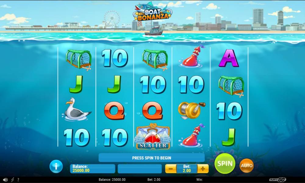 Интерфейс в Boat Bonanza оригинальный и симпатичный. Игровое поле скрыто под толщей воды, на поверхности которой плавают 2 бонусных кораблика. Панель управления сведена к минимуму: кнопка "i" вызывает справку по слоту, далее следуют 2 информационных окошка с балансом и выигрышем, за ними расположено меню выбора ставки с "+" и "-" для выбора значений. Справа от панели можно увидеть две стандартные кнопки для определения способа запуска спинов — в ручном или автоматическом режиме.