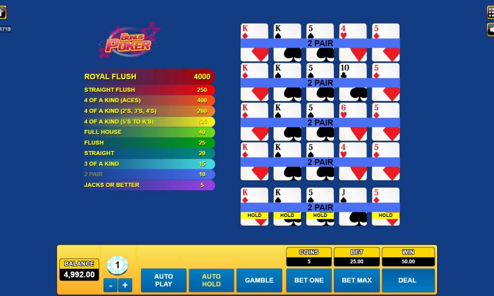 В Bonus Poker оплачиваются стандартные покерные комбинации от пары валетов до роял флеша. Отдельные коэффициенты расчета выигрышей предусмотрены для трех разновидностей 4 of a Kind.