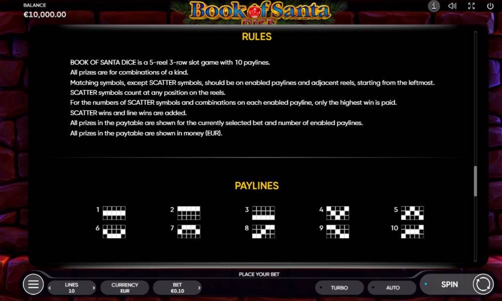 Онлайн-слот Book of Santa Dice имеет 5 барабанов в 3 ряда и 10 линий выплат, количество которых можно выбирать. Для выигрыша необходимо, чтобы 5 одинаковых символов выпали на соседние барабаны, расположенные подряд начиная с крайнего левого. Символ Wild-Scatter считается независимо от места своего появления на игровом поле. Диапазон ставок – от 0.1 до 45 евро. Символы, применяемые в игре, делятся на 3 группы: