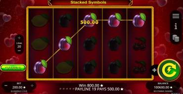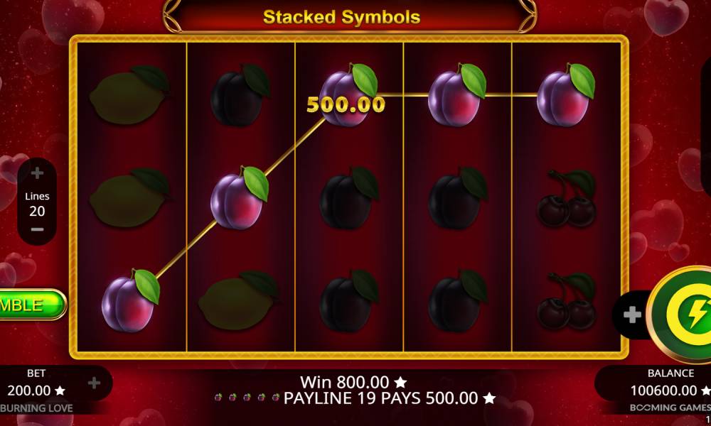 У слота логично расположены элементы интерфейса. Слева по центру можно выбрать количество линий (по умолчанию установлены максимальные 20). Внизу слева находятся кнопки для увеличения и уменьшения ставки. Там же указана и текущая ставка. Под полем появляется информация о выплате: ее размер и символы, которые сформировали выигрышную комбинацию. Справа вверху есть 3 кнопки. Это меню с настройками и активацией автоматических вращений, информация с таблицей выплат и правилами, и еще 1 раздел для выбора ставки. В меню можно выбрать язык и включить интерфейс для левшей (кнопки перенесутся с правой стороны окна на левую). В правом нижнем углу, над балансом, есть 2 кнопки: ручной запуск и +. Если нажать на плюс, слева появятся несколько дополнительных кнопок — запуск 50 автоматических вращений, игра по максимальной ставке, ускорение движений барабанов (чтобы результат отображался на поле быстрее), включение-выключение музыки и звука. Для всех, кто собирается поиграть в Burning Love, у нас есть такие советы:
