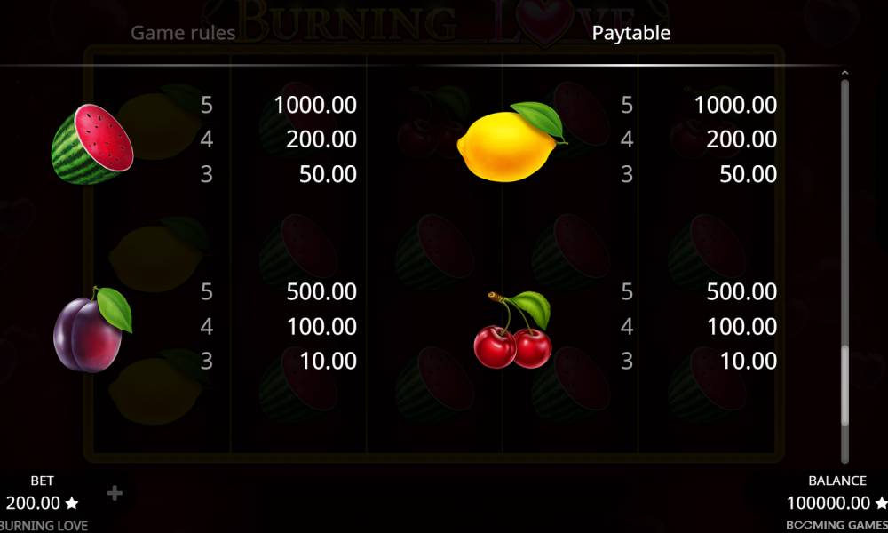 Не нужно тратить реальные деньги сразу: сначала можно изучить слот в бесплатном деморежиме. Его можно запустить в любом казино, где есть Burning Love. А можно запустить демо на этой же странице. Мы разместили демоверсию перед обзором. В ней у гемблера есть баланс 100 000 баллов для пробных ставок. А если их не хватит — обновите страницу.