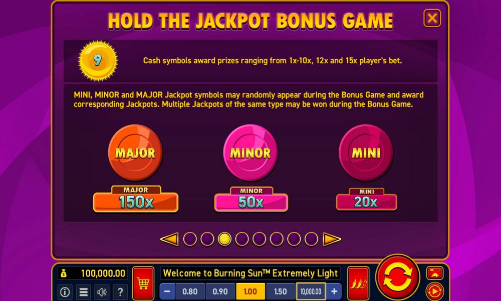 В слоте Burning Sun Extremely Light предусмотрены джекпоты, которые могут быть выиграны через бонусную функцию Hold the Jackpot.