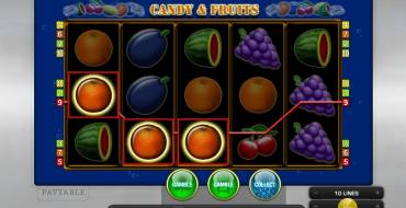 Candy & Fruits – видео-слот с пятью барабанами, десятью линиями и тремя рядами картинок на экране. Набор доступных функций весьма ограничен. Есть лишь базовые символы, особый элемент Wild и две разновидности рискованной игры по шансам. Пользователи могут играть на игровом автомате «Леденец и фрукты», активировав от одной до десяти линий. Ставка по каждой позиции может варьироваться от одного цента до двух евро. Таким образом, на спин нельзя поставить больше двадцати евро. Обычные картинки образуют выигрышные цепочки по стандартным принципам. Несколько одинаковых элементов должны оказаться на одной активной линии рядом друг с другом, начиная с первого барабана слева. Отдельно взятая последовательность дает выплату лишь по старшей комбинации. Но по результатам спина может сформироваться несколько выигрышных вариантов (на разных линиях). Сумма выплаты рассчитывается по классической формуле: ставка по линии умножается на коэффициент комбинации, указанный в специальной таблице (он может быть от х20 до х5000). Общий выигрыш за спин можно забрать сразу или поставить деньги (все или половину) на кон в раунде на удвоение. Он представлен в двух разновидностях, хорошо знакомых опытным любителям азартных развлечений подобного рода. Первый вариант представляет собой игру по шансам, в которой нужно угадывать цвет закрытой карты. Второй предусматривает движение по ступеням лестницы, и каждый шаг может быть выигрышным или проигрышным. В обеих версиях удачный исход на любом этапе удваивает текущую сумму, а неудачный означает ее проигрыш. В одном подходе можно играть несколько раз подряд, но имеется установленный лимит максимальной выплаты. Производитель утверждает, что модель возвращает 96% сделанных ставок на длинном игровом отрезке.