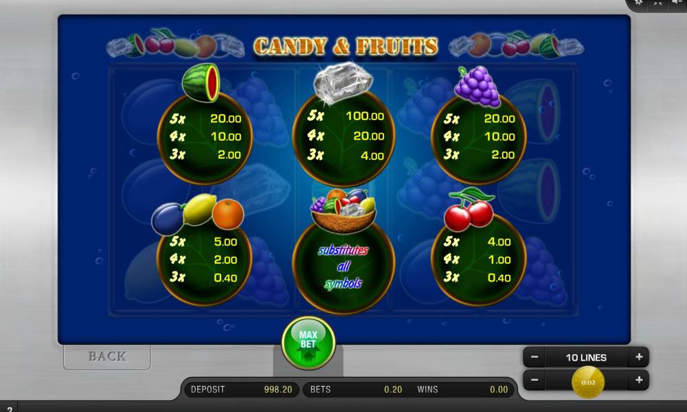 Безусловно, Candy & Fruits не понравится любителям многофункциональных азартных игр с большим количеством призовых опций, бесплатных спинов и прочих бонусных возможностей. Она, скорее, для любителей классических автоматов, хотя ее уже вряд ли можно считать таковой от начала до конца. В игре действуют довольно высокие множители расчета выплат по комбинациям. При этом максимальный показатель далеко не самый большой (х5000), а вот минимальный весьма неплох (х20).