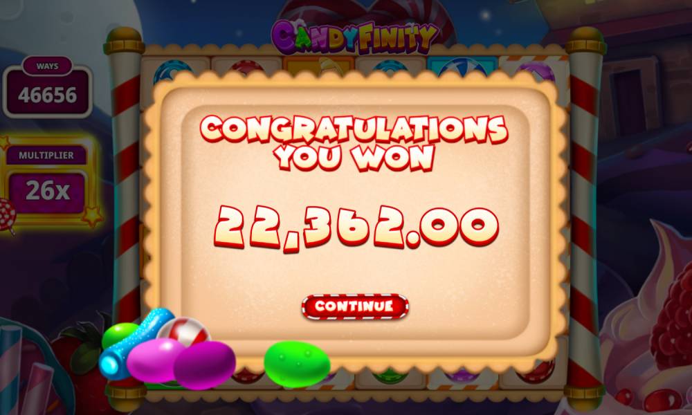 В начале лета 2023 года Yggdrasil Gaming добавили в коллекцию «конфетных» слотов еще один: Candyfinity. Яркий дизайн, огромный (х38837) максимальный множитель и такое же огромное количество линий выплат (до 46656), увеличивающееся в размерах при каждой выплате поле — вот главные плюсы слота. За счет супер-высокой волатильности выигрыши сыпятся очень часто, и респин с увеличением поля срабатывает регулярно. Это добавляет интереса к процессу, а также повышает шансы игрока получить более крупный приз.