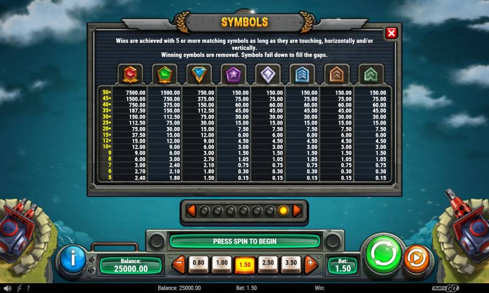 Игровой автомат Cash of Command от провайдера Play'n Go имеет стандартное игровое поле, состоящее из сетки 9х9. Выплаты производятся по системе Cluster Pays.